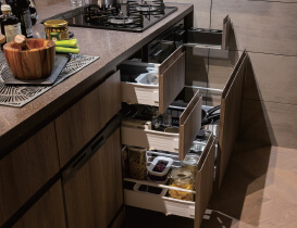 収納しやすく、スパイスラック付きのスライド式のキャビネットを採用。