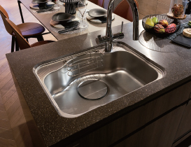 水はね音を軽減したシンクと、ヘッドを引き出せる浄水器付シャワー水栓です。