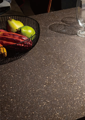 実用性と美しさを兼ね備えたデュポン社製のコーリアン天板を採用しました。しっとりとした落ち着きある質感で、キッチン空間をより上質に演出。耐候性・耐熱性・耐衝撃性やメンテナンス性にも優れ、長く快適に美しいキッチンを保ちます。