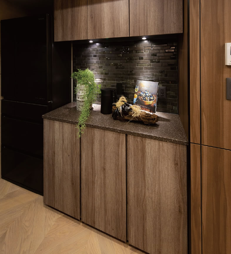 整理整頓と家事効率を上げる食器棚。お気に入りの家電を魅せるカウンター付きです。