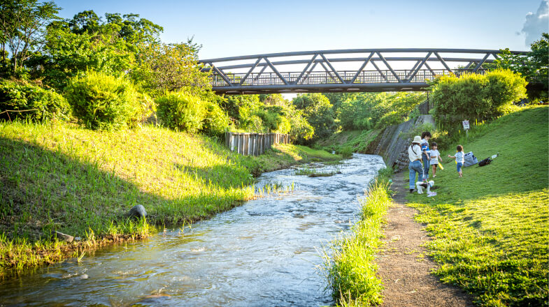 大型遊具やスポーツ施設など、子供がのびのび遊べる環境が充実。せせらぎに癒やされながら、ウォーキングやピクニックも満喫できます。