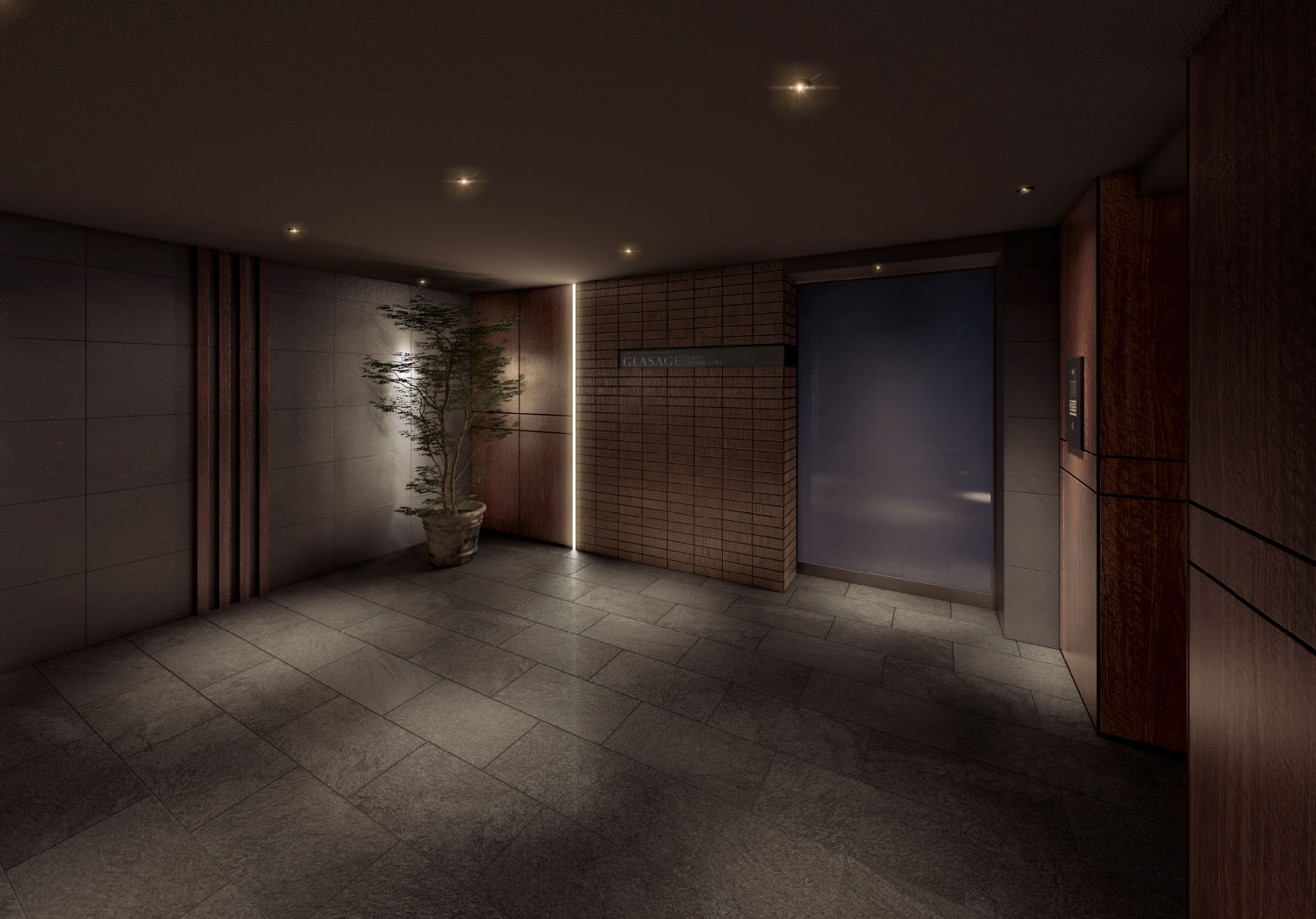 都市邸宅として相応しい意匠を施したエントランスホール。ファサードデザインの繊細な美意識を投影した上質な空間は、都市の喧噪を忘れさせる私邸へのプロローグ。住まう方、訪れる方を優しく招き入れます。